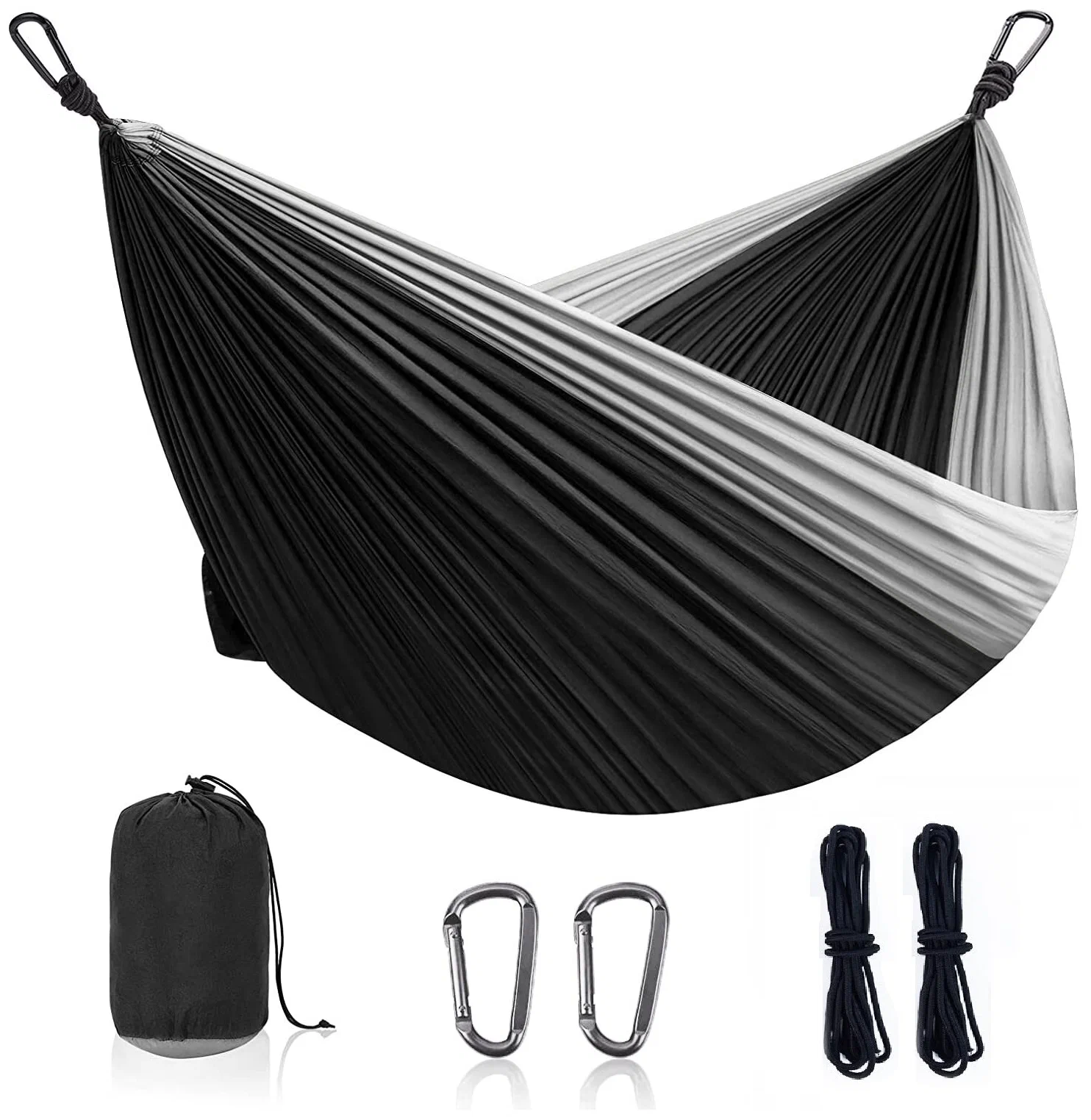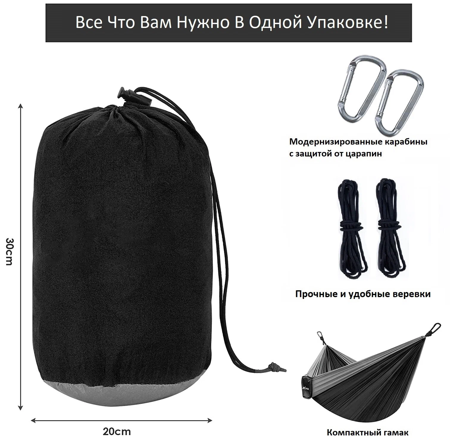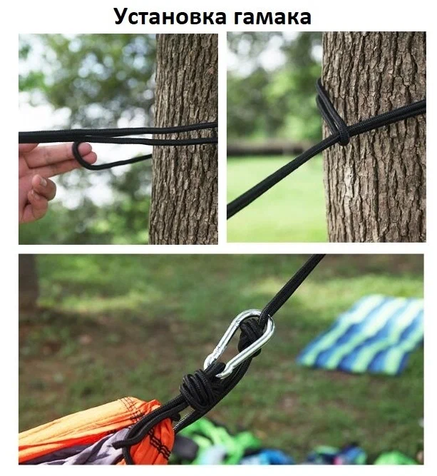 В комплекте: Гамак с прикрепленным мешочком, 2 веревки по 2 метра, 2 карабина
