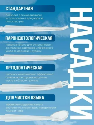 Одной из особенностей данного ирригатора является наличие четырех насадок. Это позволяет использовать его для ухода за зубами и деснами разных людей, делая его удобным и экономичным решением для всей семьи.