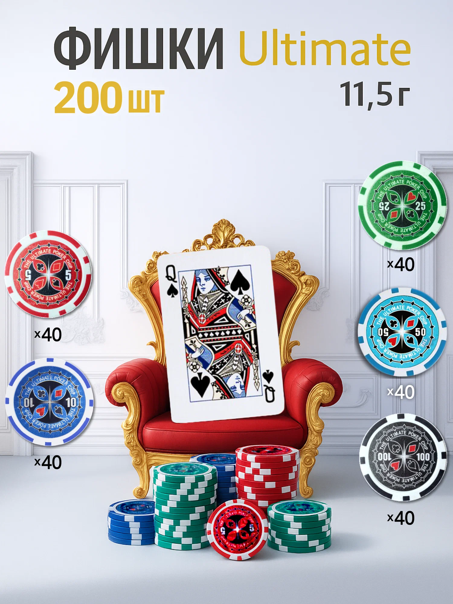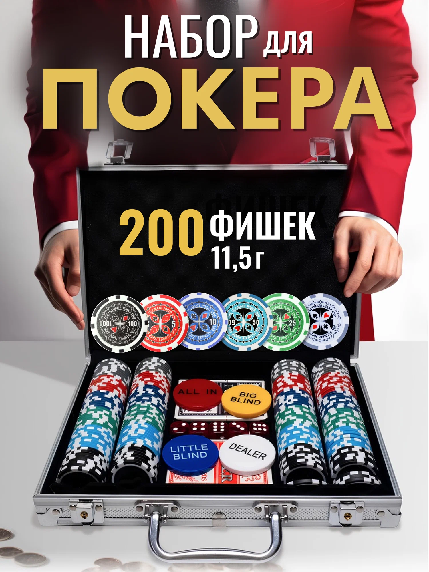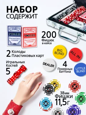 В наборе вы найдете 200 фишек с номиналом, что позволит вам полностью погрузиться в атмосферу игры и почувствовать себя настоящим профессионалом. Данный покерный набор позволяет играть в покер на костях