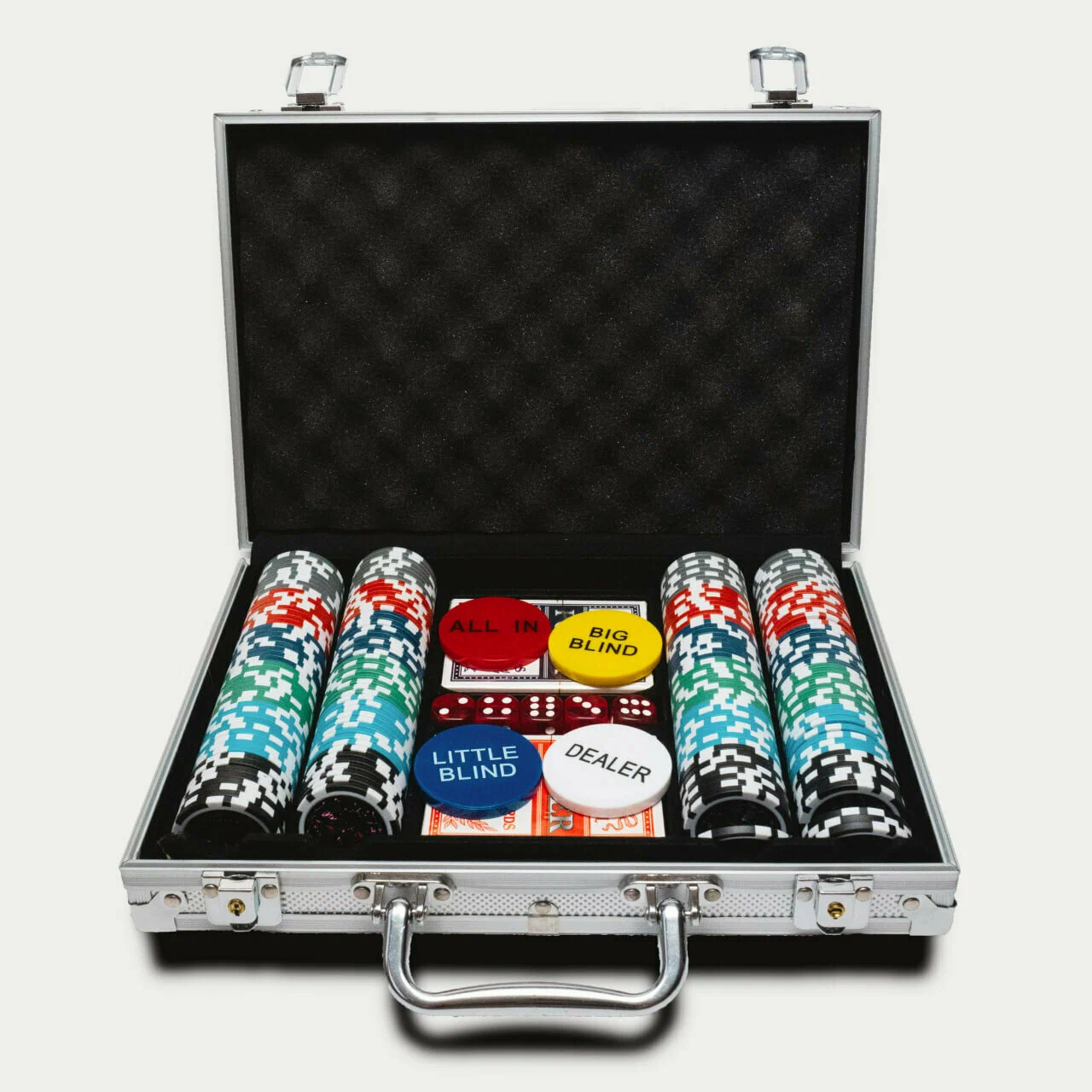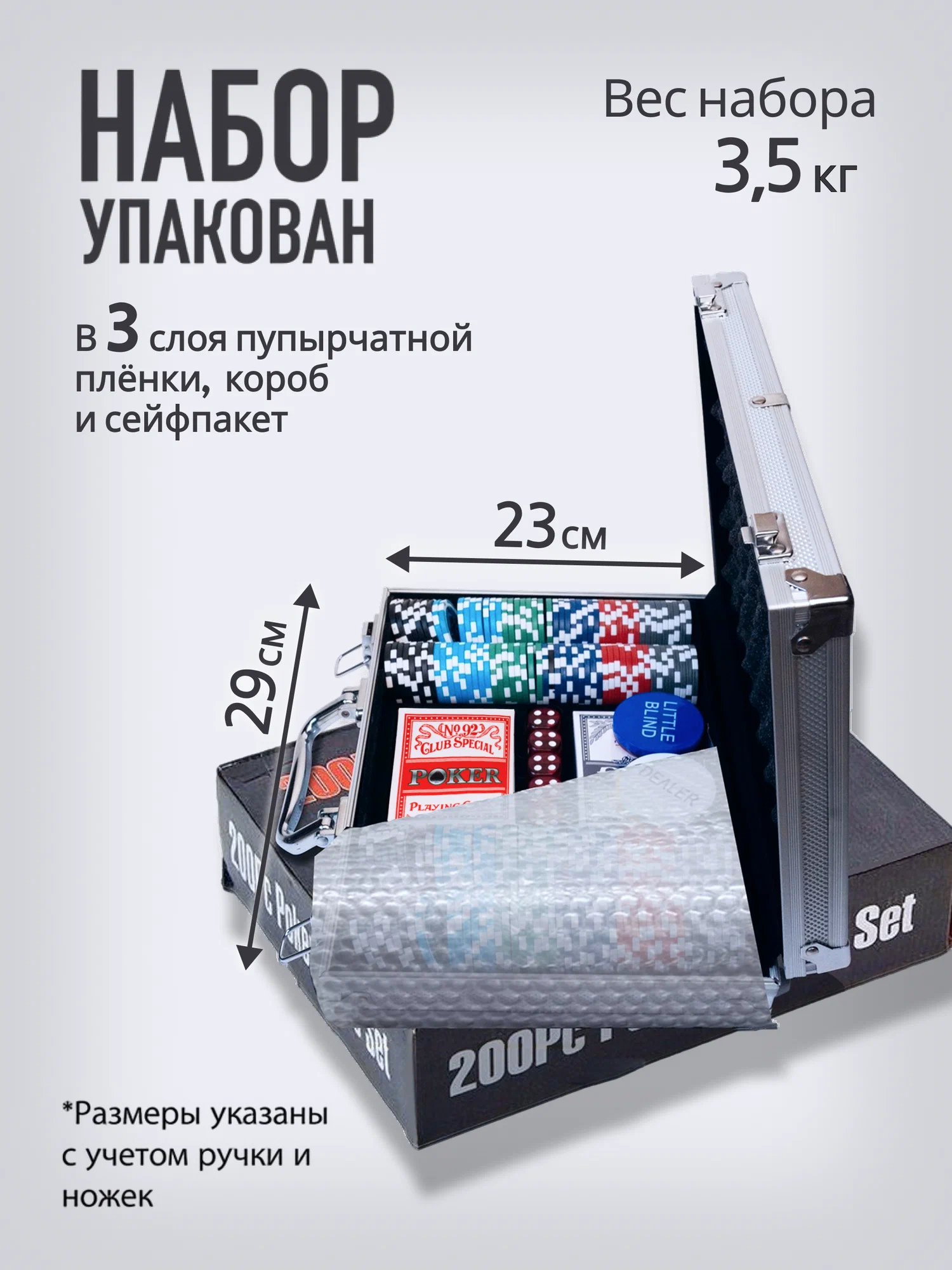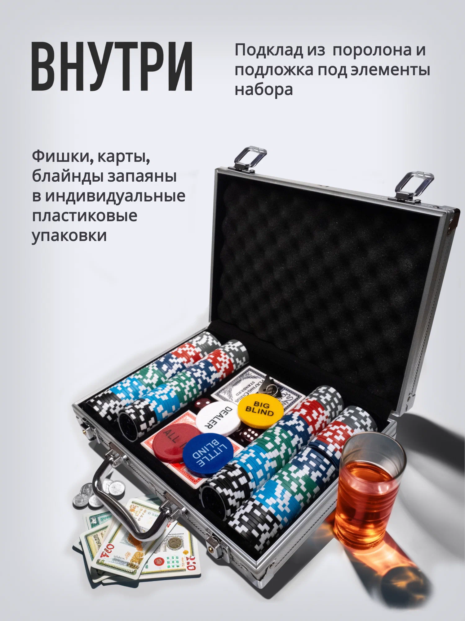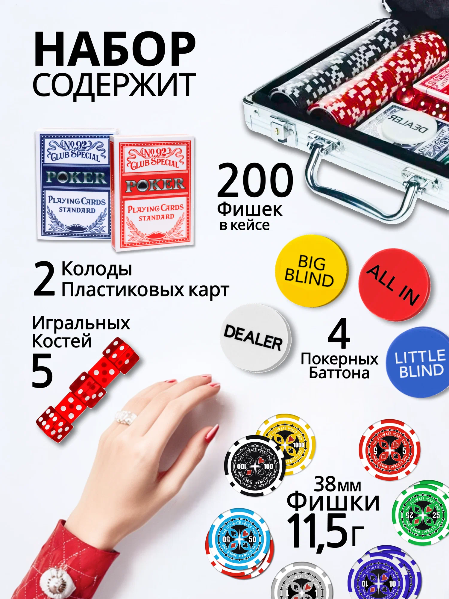 Все фишки аккуратно упакованы в алюминиевый кейс, который обеспечивает их надежную защиту от повреждений и загрязнений. Кейс также удобен для переноски и хранения набора, что делает его отличным выбором для любителей игры в покер.