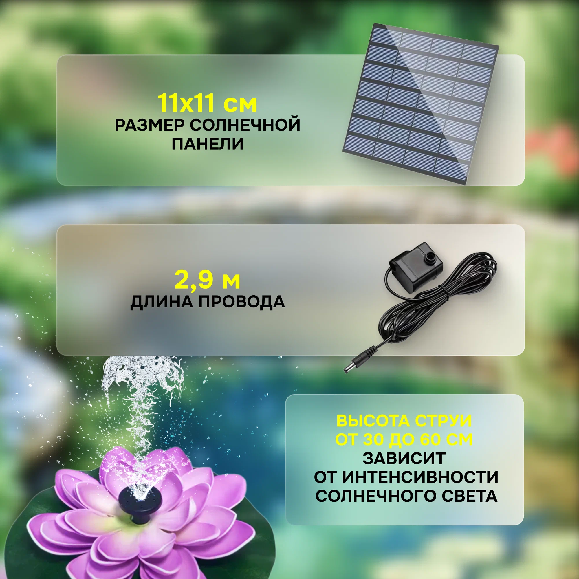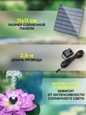 Фонтан для пруда работает от внешней солнечной панели, длина кабеля составляет 2.9 метра! Устройство оснащено собственным насосом и в комплекте с ним идут различные насадки для выбора любого понравившегося варианта струи фонтан. Высота струи может достигать 70 см, в зависимости от интенсивности солнечных лучей (в тени фонтан работать не может).